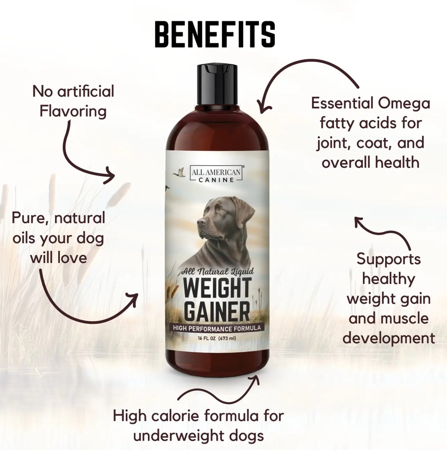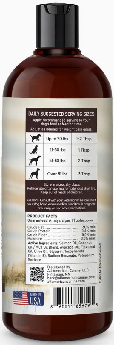 Explore the nutritional prowess of All American Canine's, Liquid Weight Gainer, a carefully formulated liquid designed for dogs in need of extra weight and muscle. This supplement is an excellent choice for underweight dogs, those involved in rigorous activities, or canines recovering from health issues.