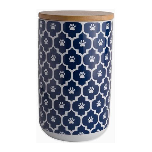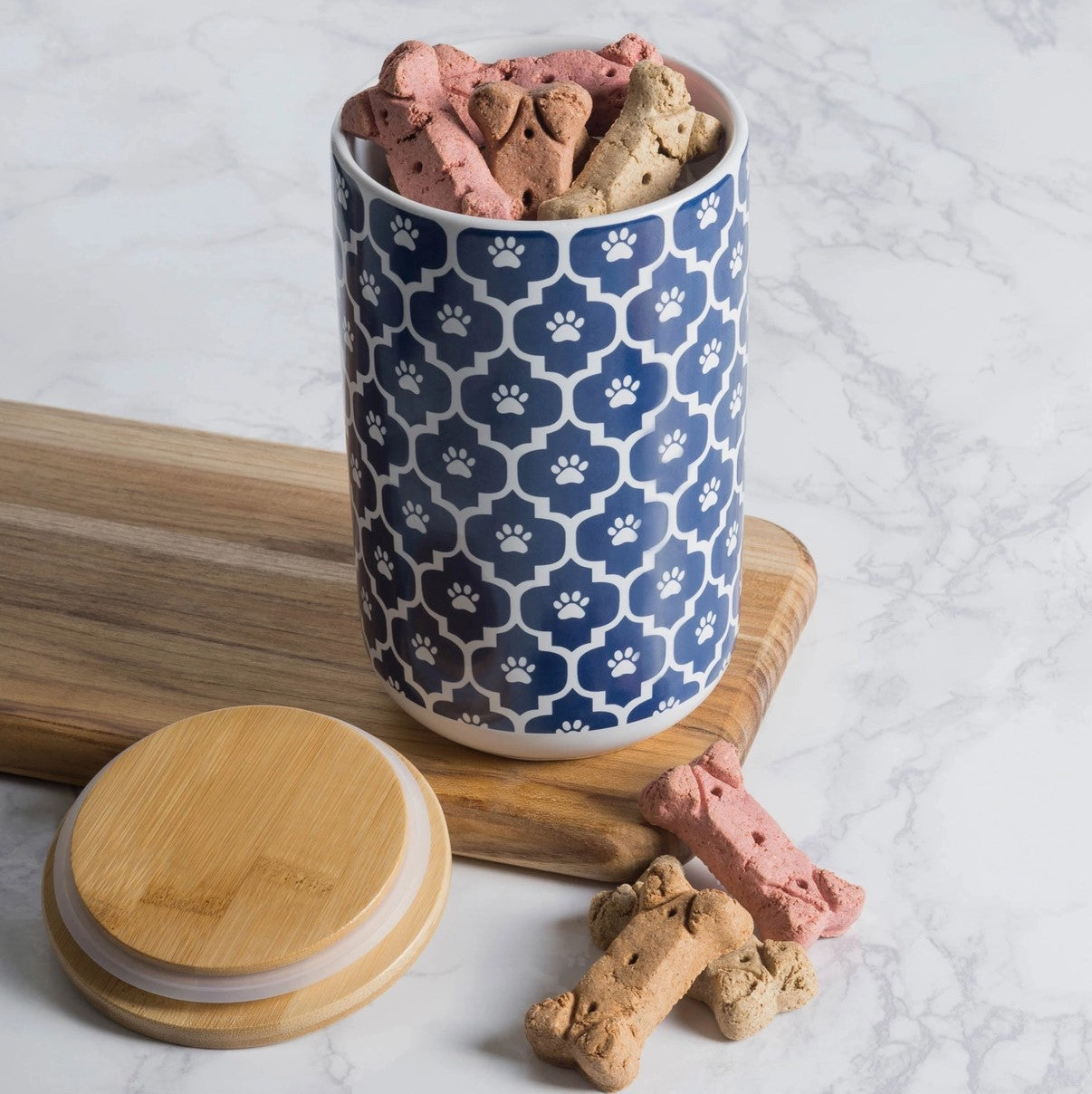 Treat canister measures 4 inches in diameter by 6.5 inches in height, perfect for storing pet food, treats for dogs and cats or even your cookies, coffee, tea, cocoa, pasta, spice and herbs. Ceramic canister is dishwasher safe. Hand wash bamboo lid and silicone ring and towel dry before use. Bamboo lid allows the food to breath, yet silicone rim is airtight to keep out moisture, humidity and pests.