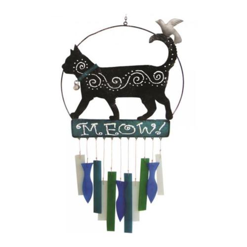 Handcrafted in Bali of powder-coated metal with sandblasted glass wind chimes which make a gentle sound when the wind blows. A great addition to garden or entryway. Makes a great gift.