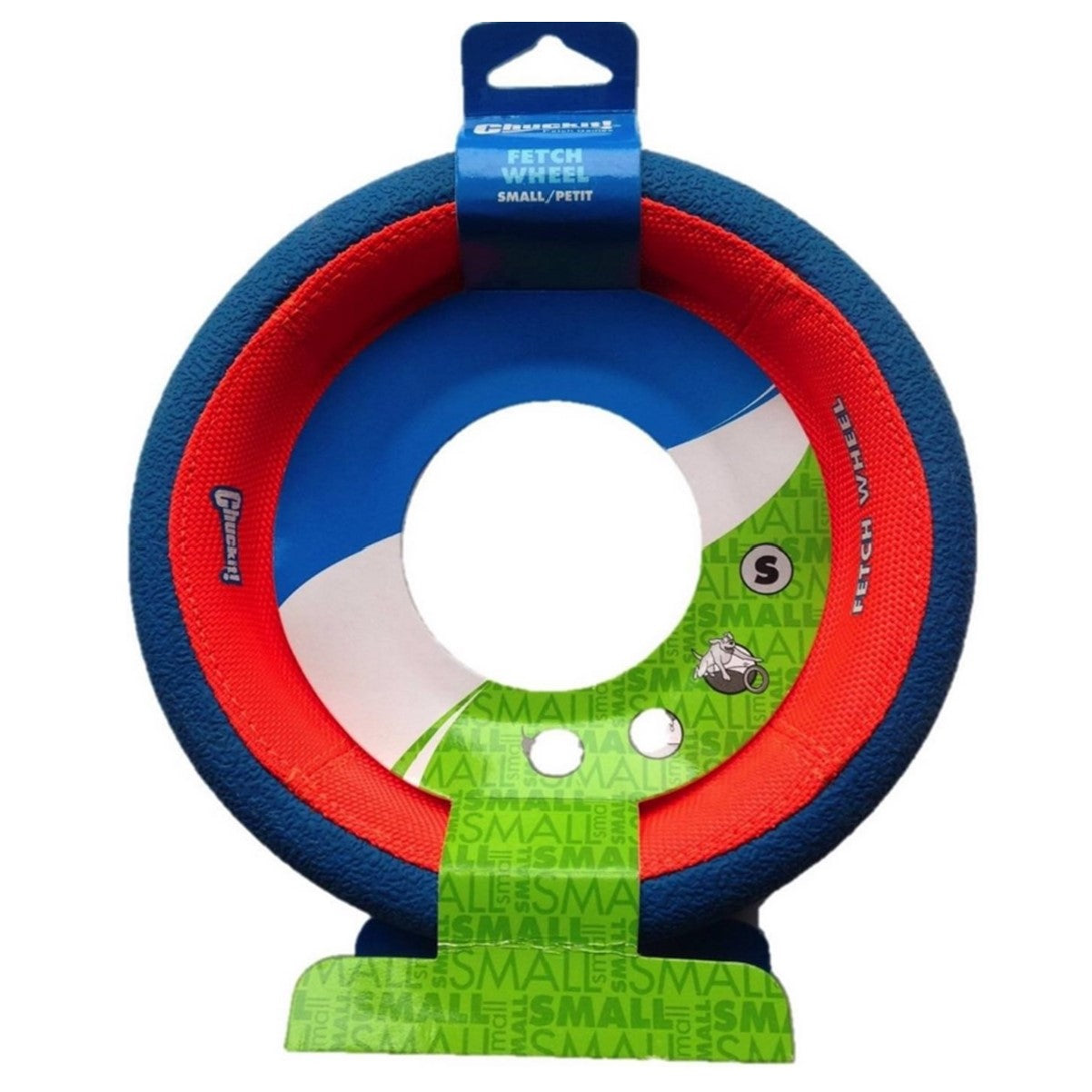 The Chuckit! Fetch Wheel is an innovative toy that bounces and floats like a tennis ball, but also rolls on the ground so your dog can chase it and fetch it back. The rubber wheel bounces and floats for unlimited, creative exercise for you and your dog! Roll the wheel to unleash your dog's natural instincts to chase and herd. The open interior allows easy pick-up for dogs of all sizes. The inner ring is made from bright, tough canvas-style nylon with double-sewn seams for added durability.