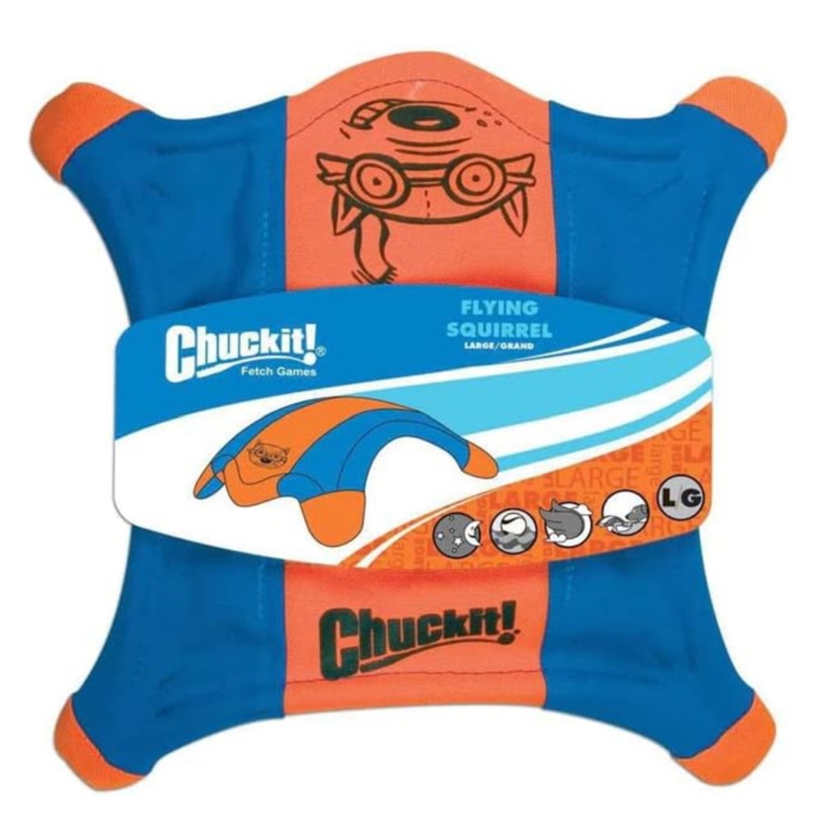 ChuckIt! Flying Squirrel Dog Toy A far flung game of fetch! Here is one squirrel who won't mind being chased down. Just grab him by a paw and throw like a flying disk. Remember to snap your wrist while throwing to give him a good spin. His spinning feet create visual excitement for you and your pet, and the raised sides make him easy to pick up! Squirrel-shaped flyer toy with raised sides for easy pick up, glow in the dark paws, and durable rubber feet. Also floats in water! Use it in the park, in your backyard, or anywhere there is plenty of room.