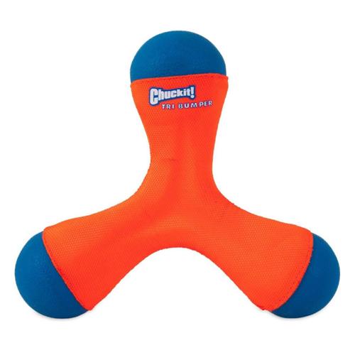 The Chuckit! Tri-Bumper tumbles end-over-end when thrown, adding excitement to games of fetch. The Chuckit! bumper toy features triple rubber end-caps for bouncing play on land and a lightweight construction that allows horizontal throwing for long-distance fetch. With a buoyant, EVA foam core, these dog water toys float in water for pets who love to fetch by the pool or on the beach. The Tri-Bumper's foam and polyester construction provides durability for long-lasting play outdoors. Designed with bright orange and blue colors, both pets and pet parents can easily spot the bumper dog toy in tall grass or on water.