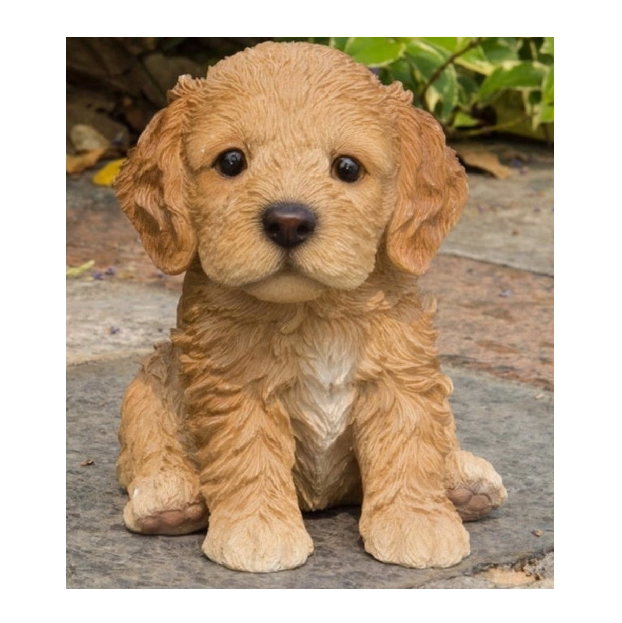 Detailed sitting cockapoo puppy figurine. Stunning craftsmanship with realistic details and features. Add a fun and unique element of surprise to your garden, deck, lawn, home, office, or any outdoor space. Makes a great gift for dog lovers.