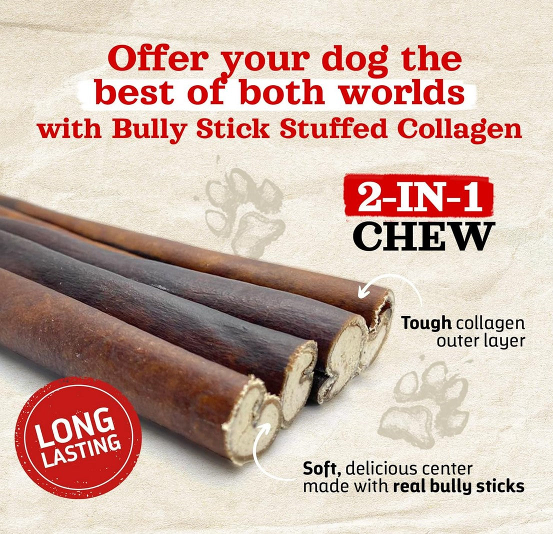 Name a better combination than Natural Farm's Bully Stick Stuffed Collagen Sticks. Dogs will receive the benefits of collagen while chewing on the rich, savory beef flavor of the bully stick filling. The engaging dual texture is long-lasting and provides many health benefits, too! Best for medium chewers.