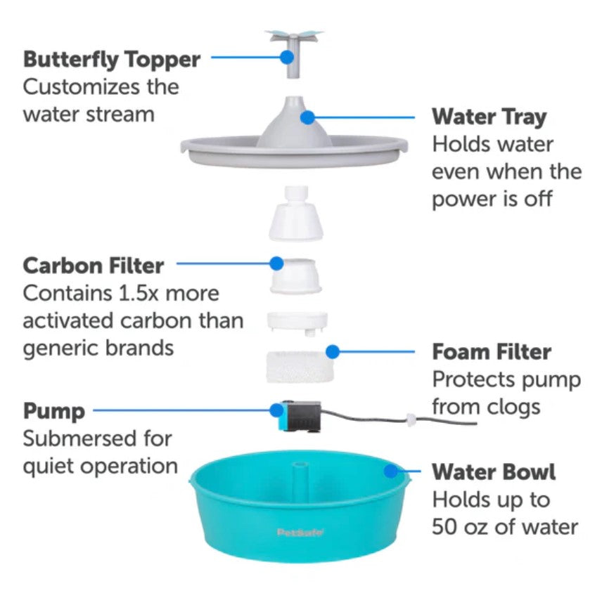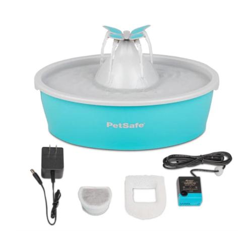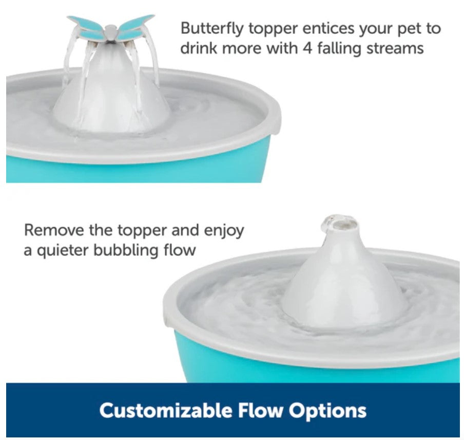 The Butterfly Pet Fountain has a cute butterfly topper that creates 4 free-falling water streams,which gives your cats lots of drinking options. You can also remove the topper for a quieter, bubbling water flow which is great for cats that are a little shy.