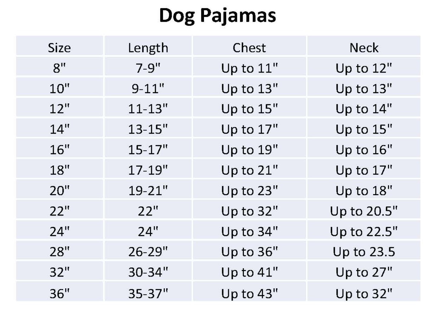 - Sizes are the length of the dog in inches from the base of the neck to just before their tail.