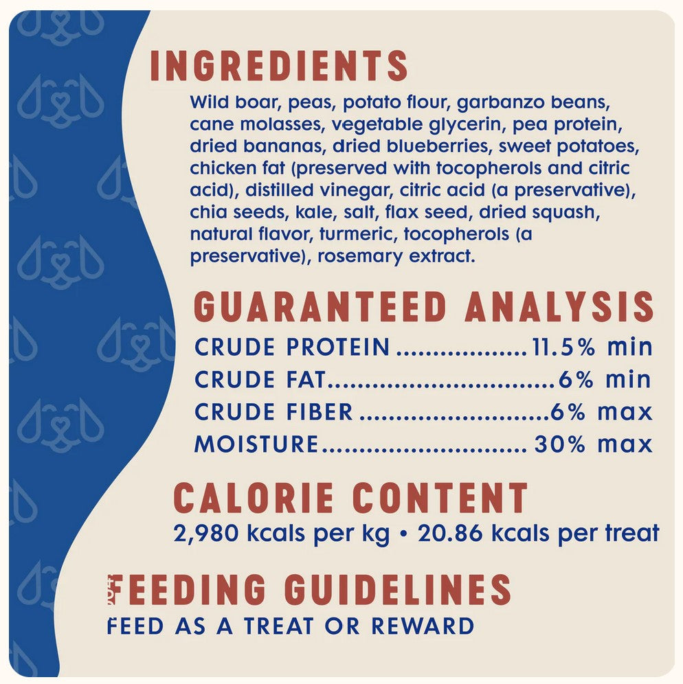 Treat your furry friend to a snack they’ll drool over with Finley's Wild Boar Recipe Griller Strips. Made with wild boar as the #1 ingredient, these tender strips are perfect for dogs of all life stages. We’ve added a wholesome boost of superfoods like blueberries, banana, kale, and squash to make each bite as nutritious as it is delicious. Crafted with care using high-quality ingredients, our Griller Strips are free from wheat, corn, soy, and artificial additives, so you can feel great about snack time. And it’s not just your pup who benefits—with every bag sold, we support people with disabilities, making these treats a win for your pet and the community.