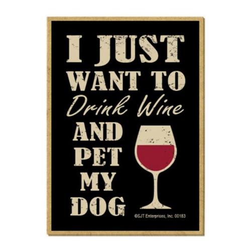 I Just Want To Drink Wine Pet My Dog Wood Fridge Magnet - measures 2.5" X 3.5" X 1/8" thick.