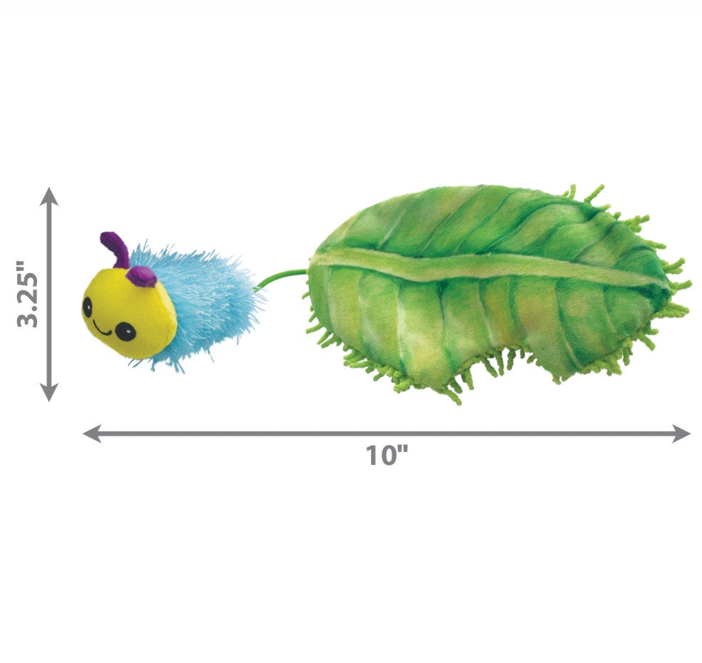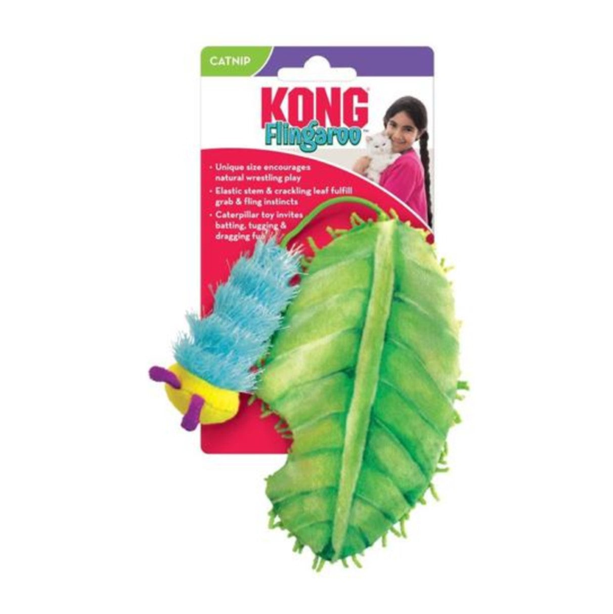 KONG Flingeroos’ unique shape is designed to fulfill healthy, full-body wrestling play needs. The elastic stem and crackling leaf fulfill grab & fling instincts while the lightweight caterpillar toy is is ideal for batting, tugging and dragging fun. KONG North American Premium Catnip and crackle sounds extend playtime.