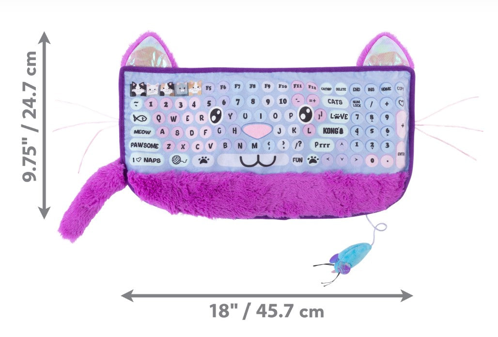 KONG Comfort Key play mat is the perfect computer accessory for your kitty coworker! Cats love a warm keyboard and now they can have one of their own without disrupting your workflow. Quirky keys like “Meow,” “Pawsome,” and fan favorite, “KONG,” will keep your cat busy while fuzzy plush keeps them purring. Heat the Comfort Key play mat in the microwave and set it next to your workspace, in their play space, or anywhere your cat likes to hang out. Crinkle material in the mouse engages cats’ instincts, as KONG Premium North American Catnip throughout the keyboard attracts their attention. Made with natural lava sand to hold heat. See heating instructions.
