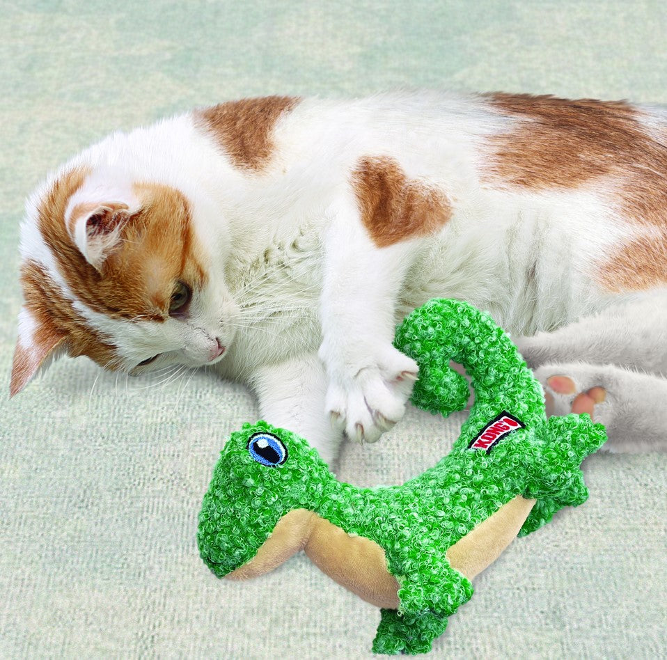 KONG Cat Luvs Lizard is ready for rounds of active play with your cat! This oversized cat toy is ideal for full-body play sessions, with uniquely textured outer material and an inner crackle that sparks wrestling and hind paw kicking. Easy-to-capture features like its head, feet, and tail make this lizard an ideal contender. KONG Premium North American Catnip inside keeps cats coming back for energetic rounds of solo play. When your cat is tired from all the action, the Luvs Lizard becomes the perfect snuggle buddy.