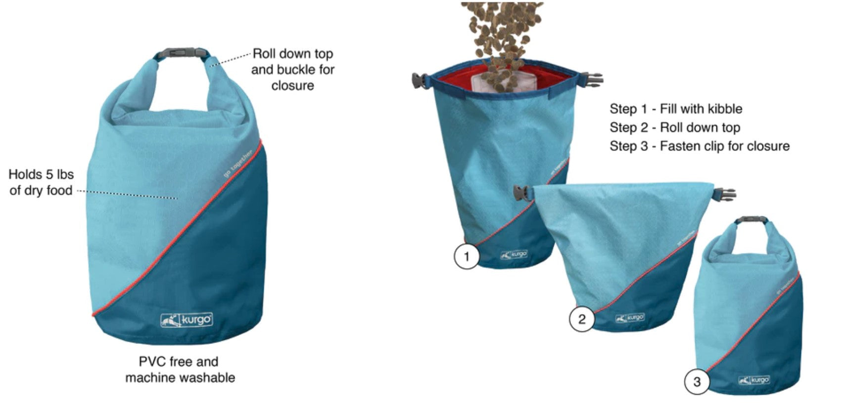 - Food-safe PEVA liner with heat sealed seams prevents kibble oil seepage
