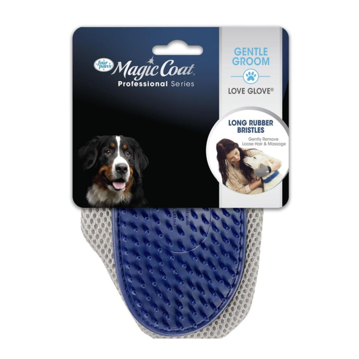 The Magic Coat Professional Series Love Glove is a dog grooming glove that easily lifts debris and excess hair from your pet's coat while massaging the skin. The flexible rubber bristles are gentle on sensitive areas and massage the skin with every stroke, giving your dog a therapeutic grooming experience while strengthening the bond between you and your best friend. Featuring an adjustable strap that makes it perfect for any hand size, this brush is also made with breathable fabric to keep your hand cool during grooming. Plus, this multi-use pet grooming glove lifts hair from furniture, carpets, and fabric. The Love Glove is ideal for all coat types.