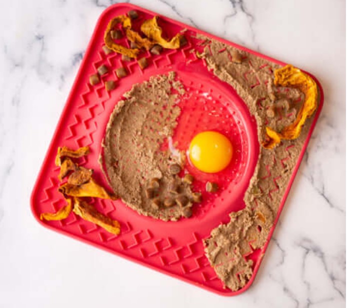 Stimulate your mutt while slowing their intake. Let your mutt lap up those healthy soft treats, supplements or food. Just spread your mutts favorite snack over the surface, let them lick it, wash it, and repeat.