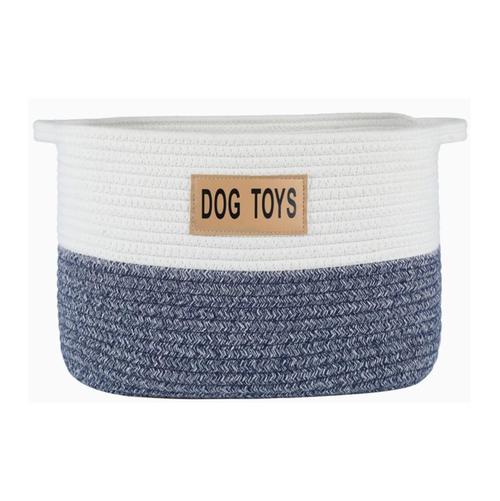 A stylish two-toned blue and white Rope Dog Toy Storage Basket will be a great addition to your home decor. This makes for an easy way to store your dog's toys. Top access allows them to pick and choose what they want to play with.