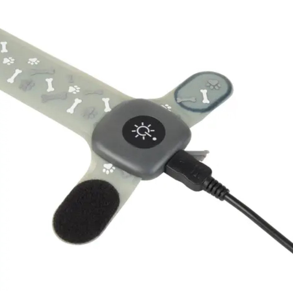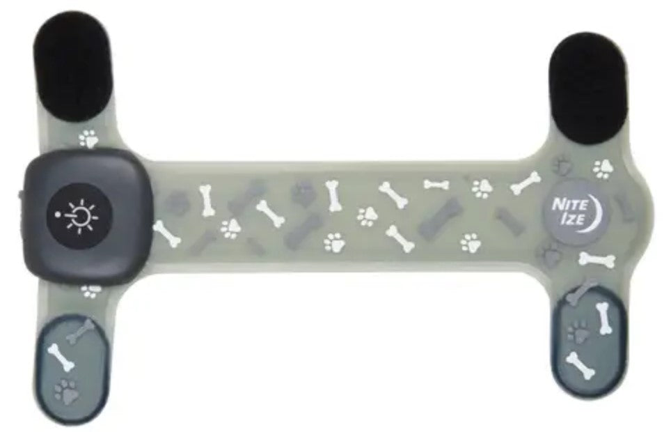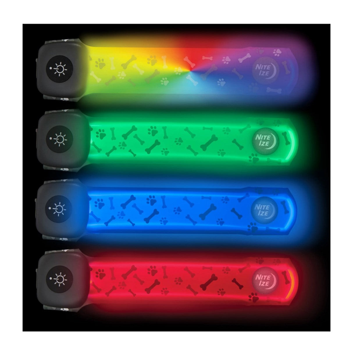 Every dog has its day, and now, every dog has its nite with the rechargeable NiteDog LED Collar Cover. Weather-resistant, durable, and low-profile, this flexible illuminated strip secures to most 1” wide collars, leashes and harnesses with two micro hook-and-loop tabs. Its bright light-transmitting polymer core is powered by rechargeable Disc-O Select Technology—choose from 3 selectable colors of green, blue, or red, plus red flash and color-changing Disc-O mode. Housed in a high-quality plastic exterior, the cover measures 6.42" (163mm) long and features a passive-reflective paw + bone pattern for extra doggone fun. Recharging in 1.25 hours via micro USB cable (not included), NiteDog brightens up virtually any collar, leash, or harness to keep your pup seen, safe, and shining.
