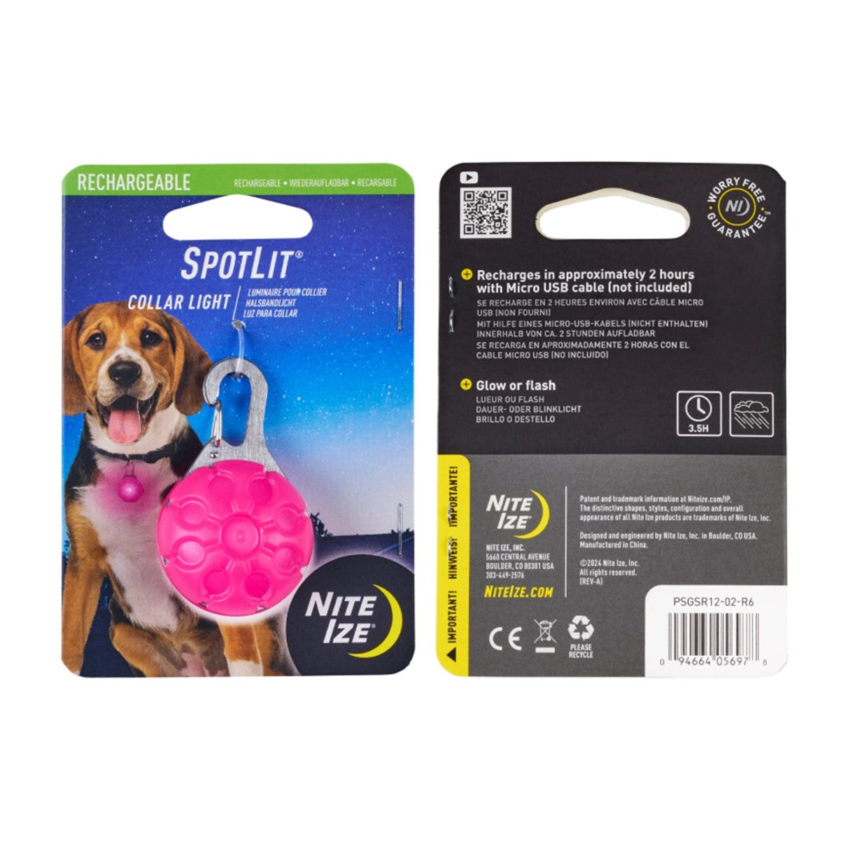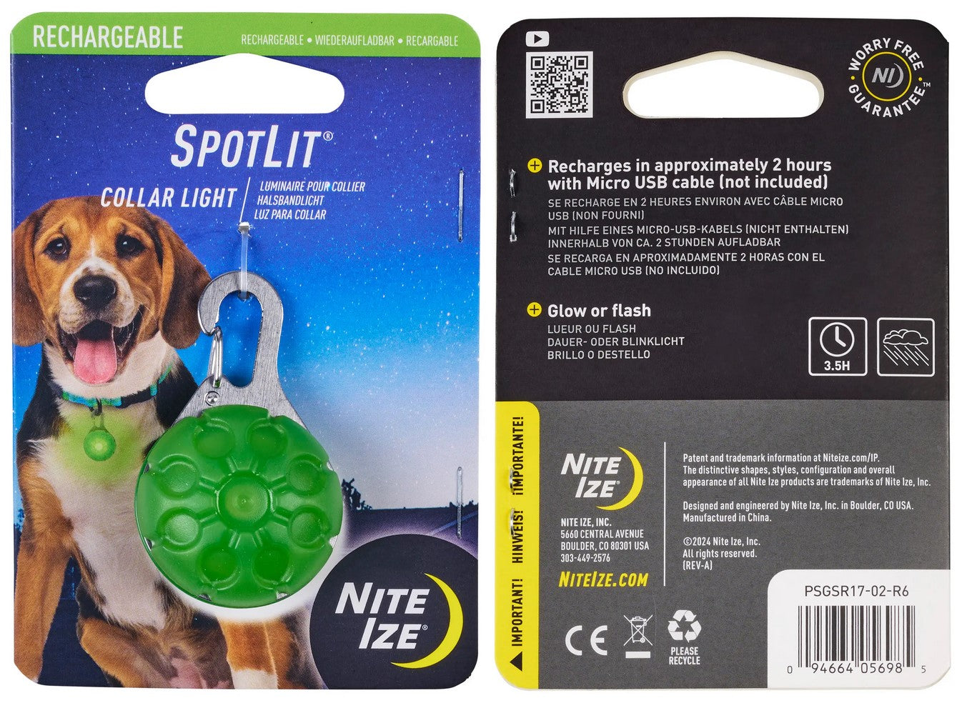 Let the light of your life shine. The rechargeable SpotLit Collar Light ensures you can always spot your dog from the park to the campsite (and ensure other drivers can too). Simply clip the light onto virtually any collar or harness and give it a push for instant illumination. Available in multiple colors, you can choose from steady glow or flash mode for added visibility. Recharging quickly in 2 hours using micro-USB cable (not included), SpotLit runs up to 3.5 hours at a time. Perfect for big backyards, busy streets, and endless adventures, SpotLit keeps your precious pup safely seen from dawn to dark.