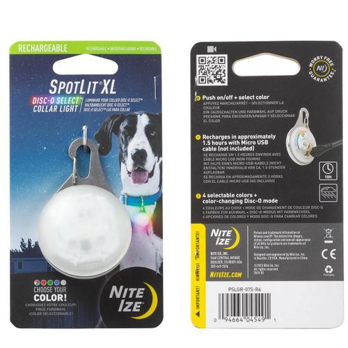 The SpotLit XL Rechargeable Collar Light isn't just bigger and brighter, it's now micro-USB rechargeable for the ultimate in convenience. Featuring a durable, stainless steel carabiner clip, this Collar Light attaches quickly and securely to the D-ring of any collar or harness to keep your pet seen and safe at night. With Disc-O Select technology, you can leave it in color-changing Disc-O mode or choose from four different colors, making it easy to keep track of multiple pets at night.