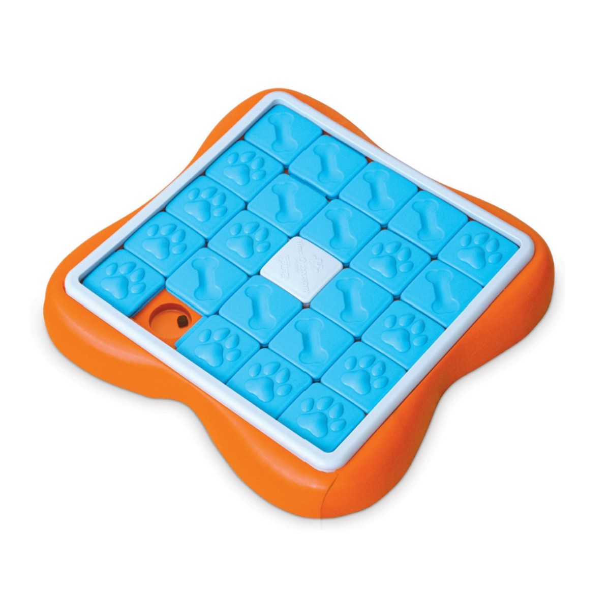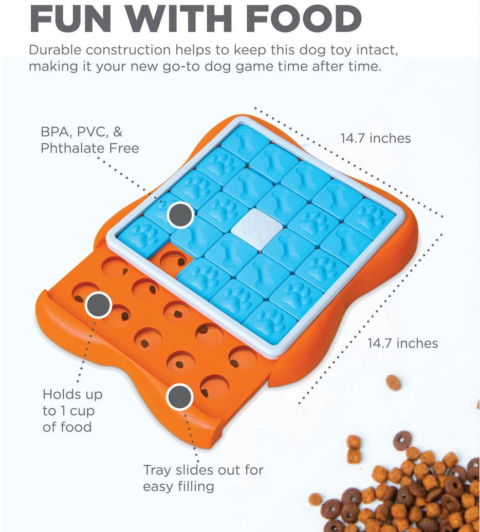 The Challenge Slider dog puzzle from Nina Ottosson by Outward Hound is an advanced level 3 game designed for pups who have mastered levels 1-2. This dog toy will promote the mental wellbeing of your dog by keeping them active and engaged while sniffing, nudging, and pawing for hidden treats! A sliding tray pulls out from underneath with 24 compartments that can hold up to 1 cup of food total. Slide the tray back in and place on the floor in front of your pup. Watch them investigate and try to figure out the puzzle on their own or help them with a bit of encouragement to show them how it works by sliding the top pieces around and showing them the hidden treats. Made from food safe materials that are BPA, PVC, and phthalate-free. Easy to clean with mild soap and warm water after the compartments have been emptied out.