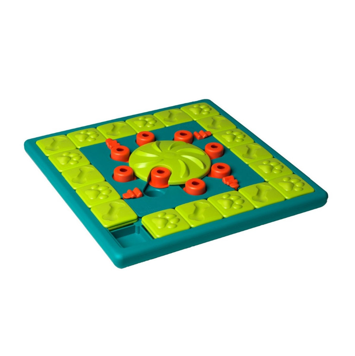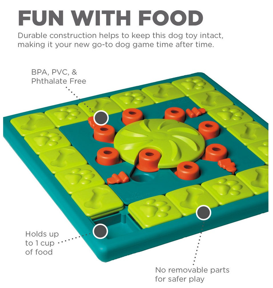 The Nina Ottosson by Outward Hound MultiPuzzle level 4 interactive dog puzzle toy will keep your dog entertained for hours as they use their natural hunting skills to seek out the hidden treats! Your pups' favorite dog treats or kibble can be hidden in the outer and central compartments by sliding the puzzle pieces and let the games begin! This puzzle is ideal for dogs who have already mastered levels 1-3 of the Nina Ottosson puzzle line. Made from tough plastic parts and food safe materials that are BPA, PVC, and phthalate-free. Hand Wash with soap and water to clean.