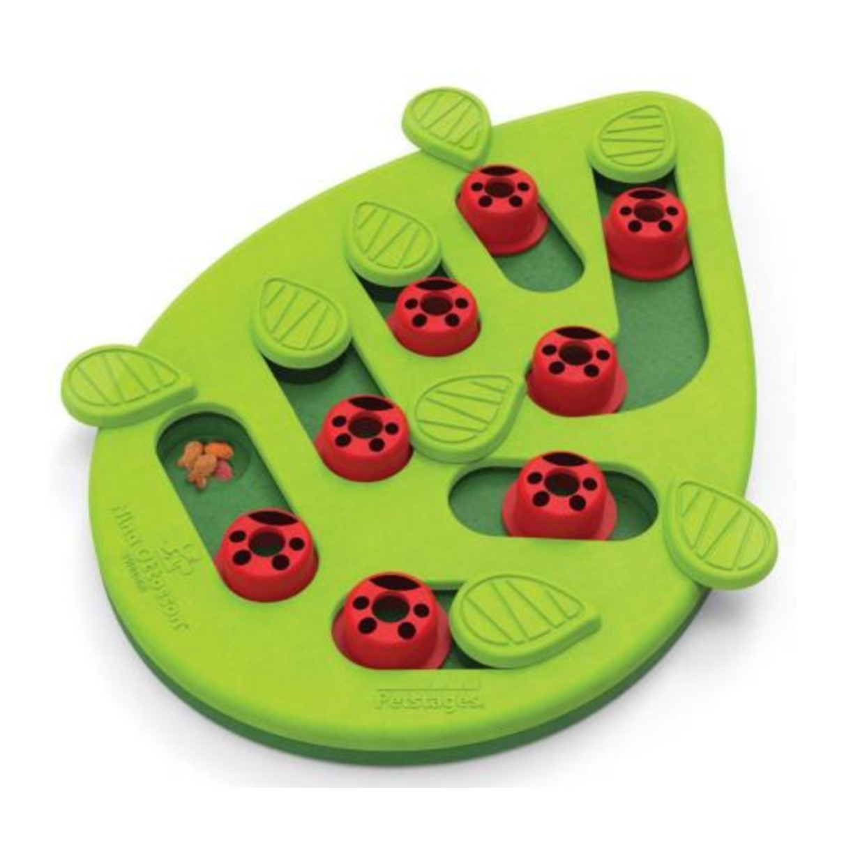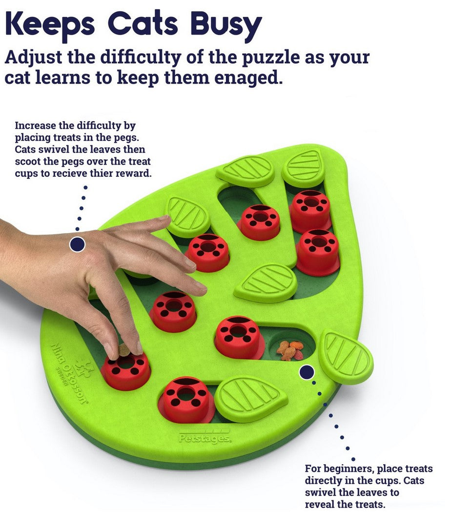 Your smarty cats will love the challenge of the Buggin' Out Puzzle & Play by Nina Ottosson. Cats bat at the pegs and swivel the leaves to uncover the 16 hidden treat compartments. Adjust the difficulty of the puzzle to make it easier for beginners or more challenging for super smarty cats. Feed your cat from the puzzle to engage their hunting and foraging instincts; the puzzle holds up to 1/4th cup of food.