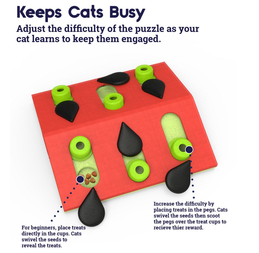 Your smarty cats will love the challenge of the Melon Madness Puzzle & Play by Nina Ottosson. Cats bat at the pegs and swivel the seeds to uncover the 12 hidden treat compartments. Adjust the difficulty of the puzzle to make it easier for beginners or more challenging for super smarty cats. Each puzzle comes with a Tips and Tricks info sheet to help you get the most out of your puzzle. Replace your standard bowl and feed your cat from the puzzle to engage their natural hunting and foraging instincts. The puzzle holds up to 1/4th cup of food, and is made with food safe materials that you can trust with your kitty.