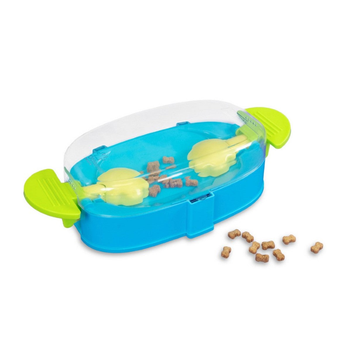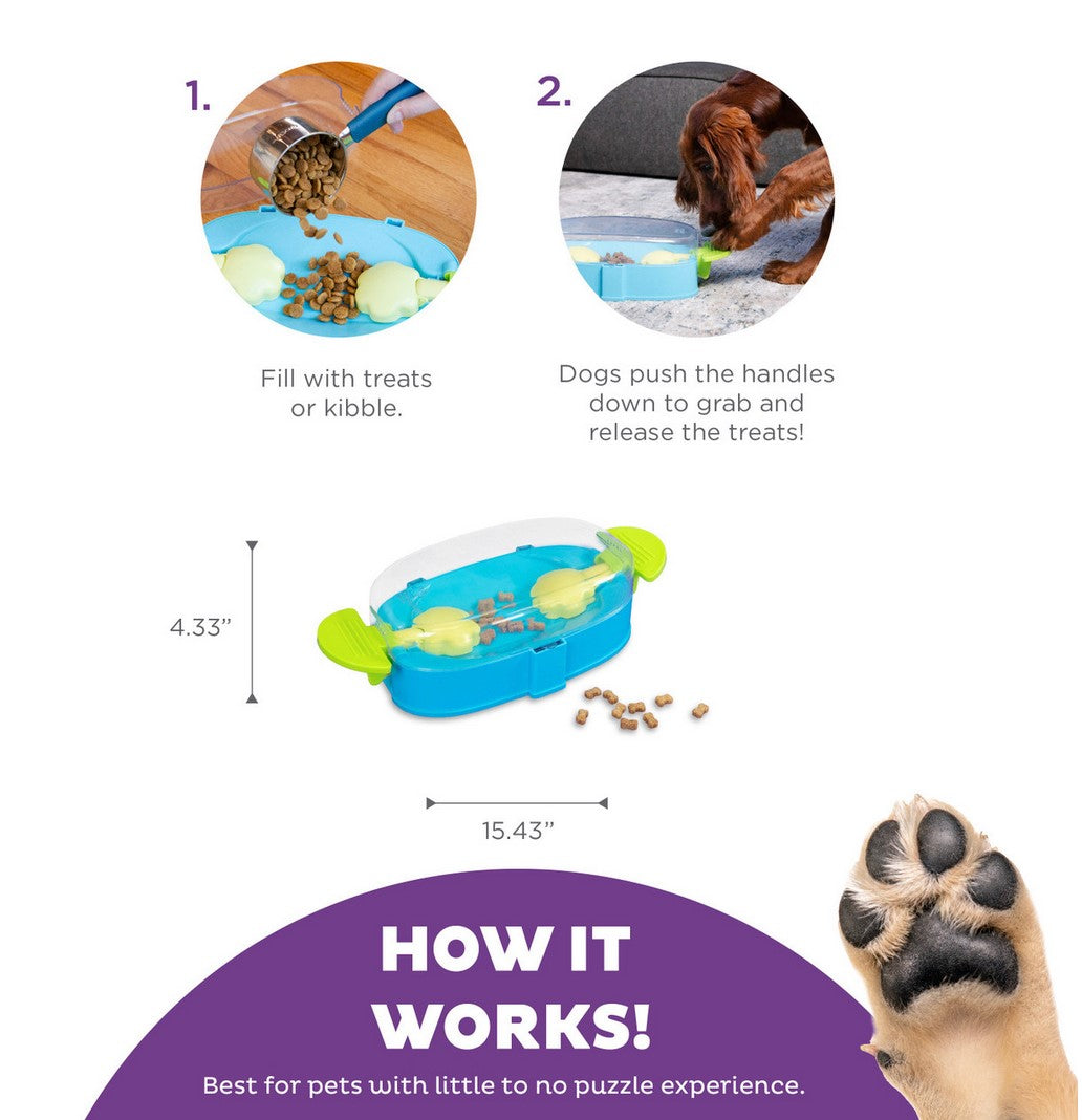 The Nina Ottosson by Outward Hound Paw N' Play interactive dog puzzle is a fun way to enrich your dog's playtime and get them excited about problem-solving games! This Level 2 Intermediate dog puzzle keeps dogs busy with a treat-focused challenge that stimulates your dog's senses and taps into their natural instincts to hunt and forage for food. As a result, our dog enrichment toys provide mental and physical exercise, help relieve stress, and reduce boredom for happier, healthier pups. The Paw N' Play features a large base you can fill with up to 1/3 cup of your pup's favorite dry dog treats or food to motivate them to solve the puzzle. Watch your dog use their brain to determine how to release the treats, then press the handles down to move the "paws" and grab the food inside. The best part? Multiple dogs can play at once – entertaining for the whole pack! Food is released in a slow, random pattern to help create a healthy eating pace. This puzzle feeder is easy to clean and made from food-safe materials that are BPA, PVC, lead, and phthalate-free for your convenience and peace of mind.