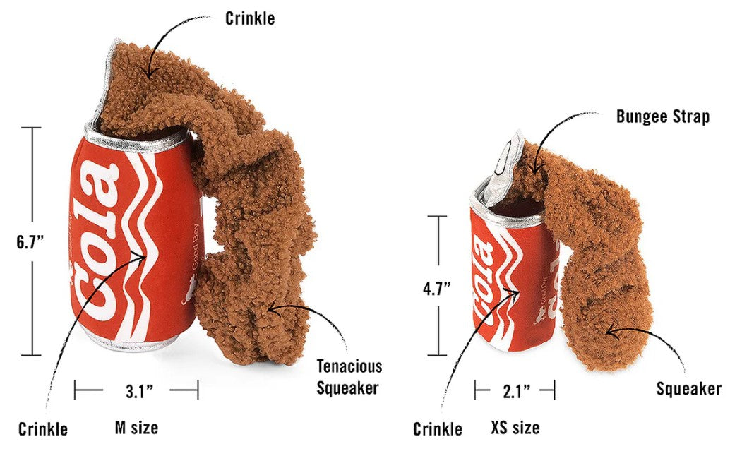 Take a sip of P.L.A.Y.’s Snack Attack Good Boy Cola toy - the fizzy-fun drink that quenches your pup’s playtime thirst! This soda-inspired toy features a tenacious squeaker that pops out for excitement and is covered in brown crinkle fabric to mimic the look of spilled soda. With crinkles on the outside for added texture, it’s a bubbly playtime experience that’ll have your furry friend begging for more!