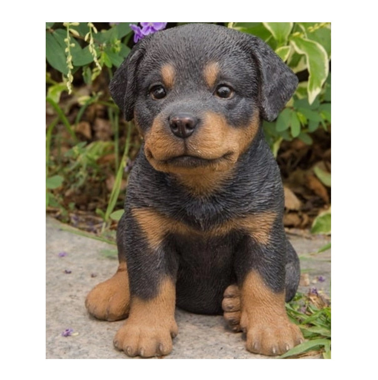 Detailed sitting Rottweiler puppy figurine. Stunning craftsmanship with realistic details and features. Add a fun and unique element of surprise to your garden, deck, lawn, home, office, or any outdoor space. Makes a great gift for dog lovers.