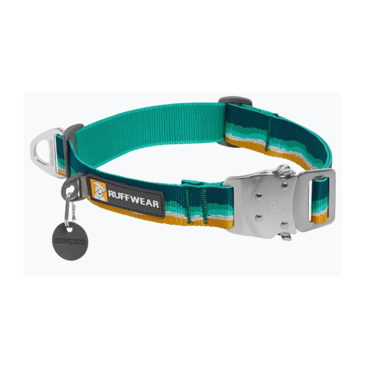 It's packed full of Ruffwear’s signature collar features: an aluminum V-ring, separate ID tag attachment point, silicone tag silencer, and strong and comfortable webbing that holds its color. Integrated reflectivity helps boost visibility in low-light conditions.