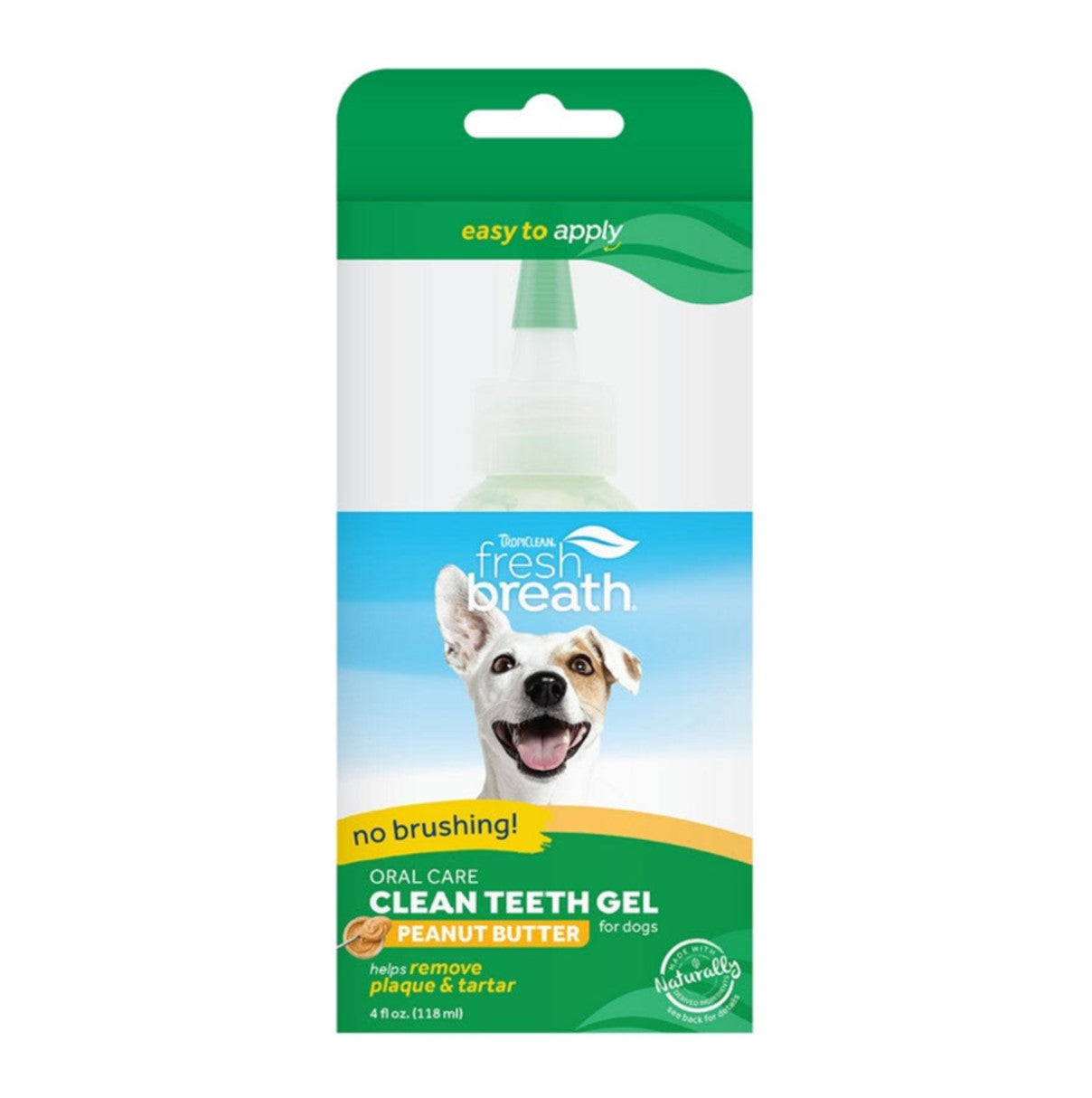 TropiClean Fresh Breath Oral Care Clean Teeth Peanut Butter Gel for Dogs supports your dog’s oral health and gives them fresh breath-no brushing required! This tasty peanut butter-flavored gel helps safely and effectively remove plaque and tartar, all while freshening their breath.