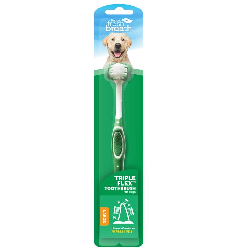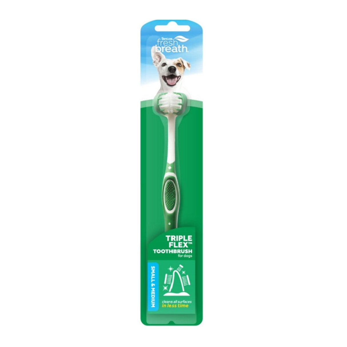 TropiClean Fresh Breath TripleFlex™ Toothbrush contains three sides of bristles to give the teeth a 360-degree clean, ensuring that no surface is left uncleaned. Brush away plaque and tartar 3X faster when paired with Fresh Breath Brushing Gel. Give your pet the dental care they deserve by repeating brushing sessions weekly. Small and medium brush is sized specifically for dogs with smaller mouths and teeth (brush is 6″ long with a 7/8″ brush head).