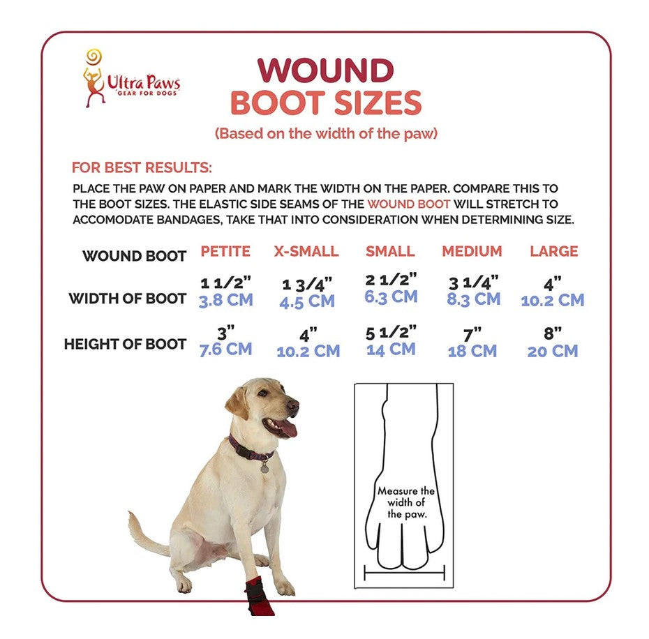 - Measure width of paw for best fit (see photo instructions). The paw must be smaller than the boot size Petite 1 ½", X-Small 1 ¾", Small 2 ½", Med 3 ¼", Large 4"