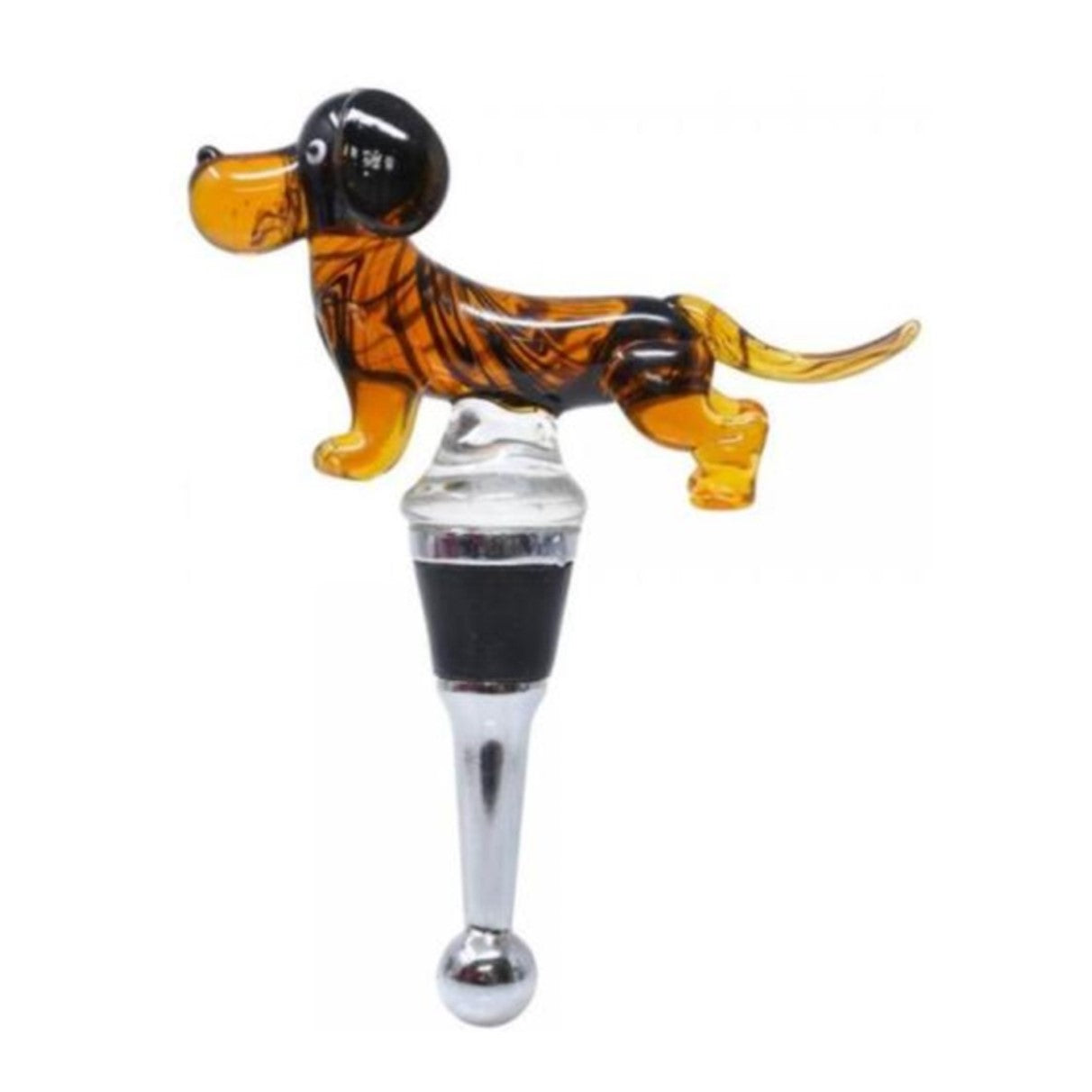 "Weiner Dog bottle stopper worthy of a toast! This unique, handmade, blown glass wine bottle stopper is full of color and wonder. Skilled artisans create each piece by hand leaving no two exactly alike. Enclosed in a gift box. Fits a variety of bottles. Try on wine, olive oil, vinegar and liquor bottles for an eye-catching decoration."